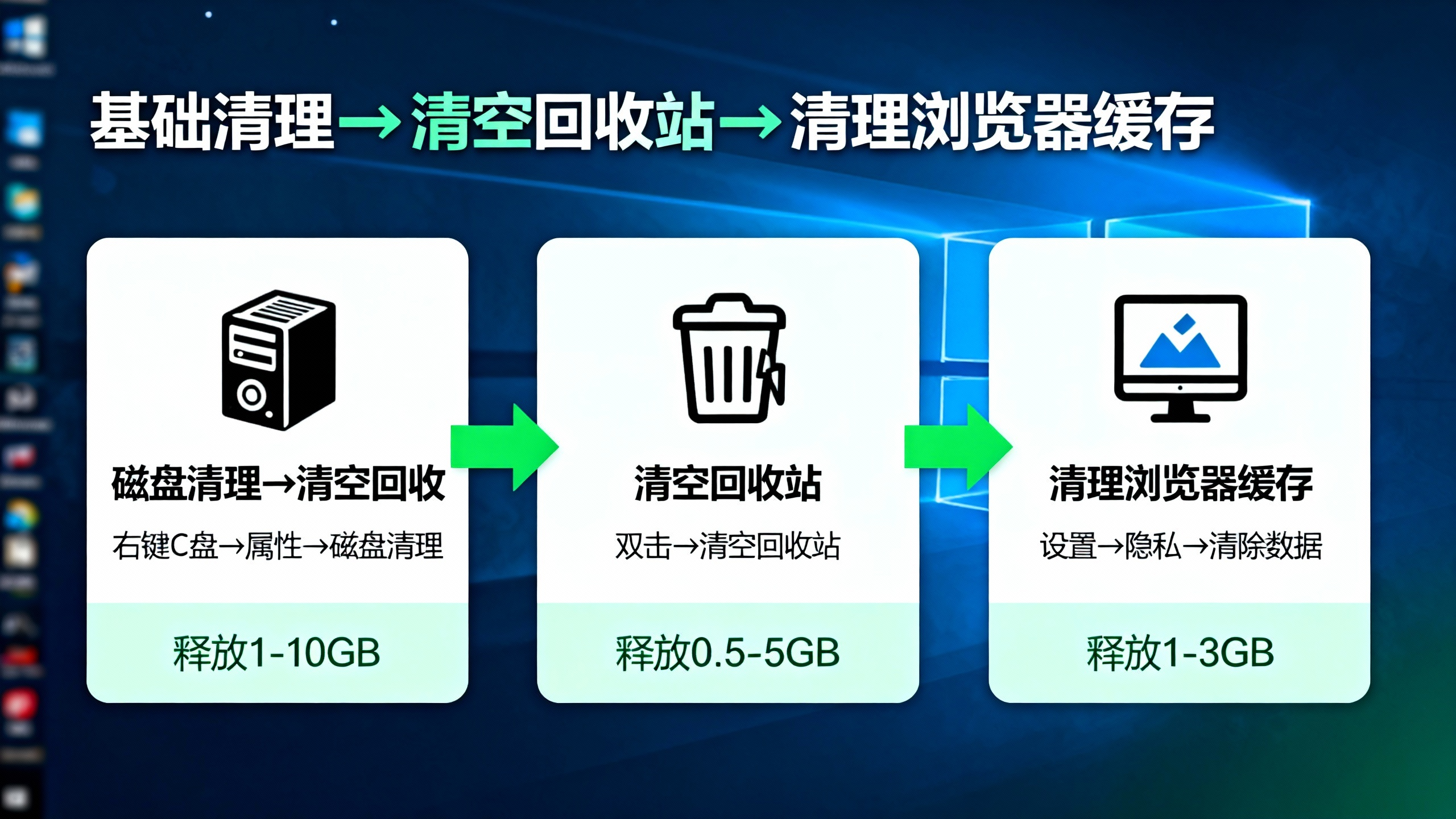 - 基础清理:磁盘清理→清空回收站→清理浏览器缓存;