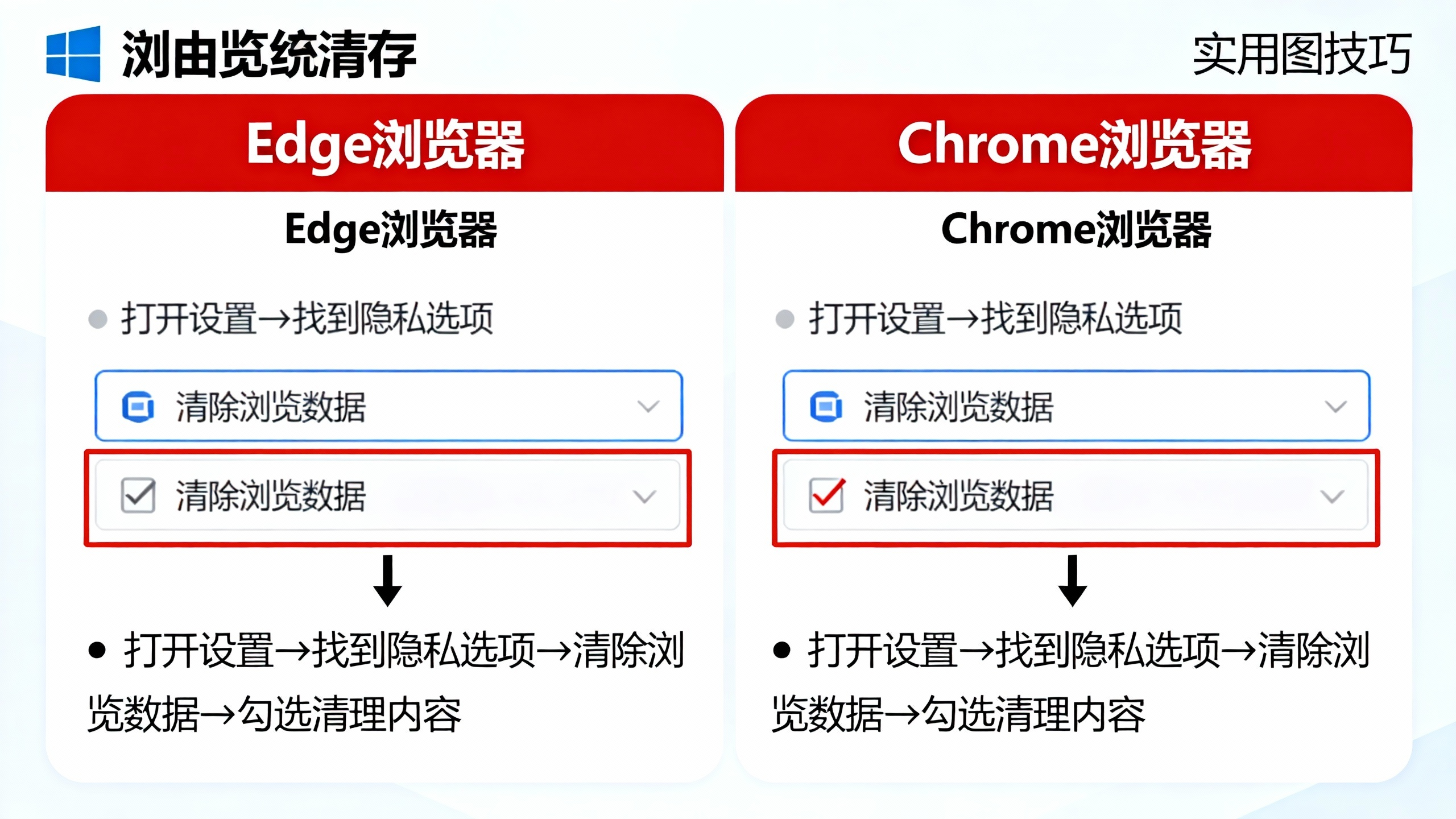 - 操作步骤:打开Edge→点击右上角“三个点”→选择“设置”→左侧“隐私、搜索和服务”→点击“清除浏览数据”;