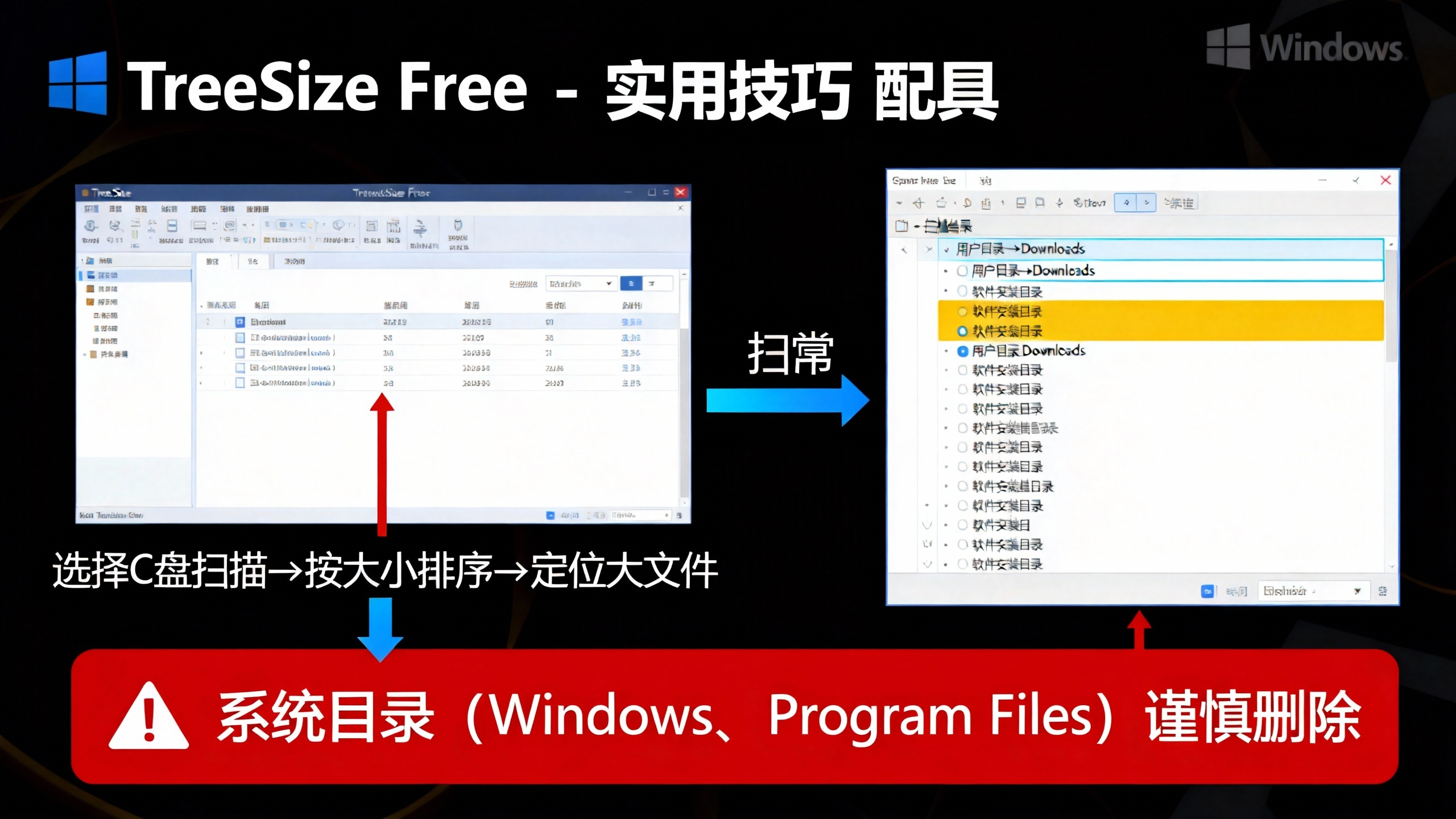- 使用方法:安装后打开TreeSize Free→选择C盘进行扫描→扫描完成后按“大小”排序文件,重点清理大体积的无用文件(如旧的备份文件、闲置的视频文件、冗余的安装包);