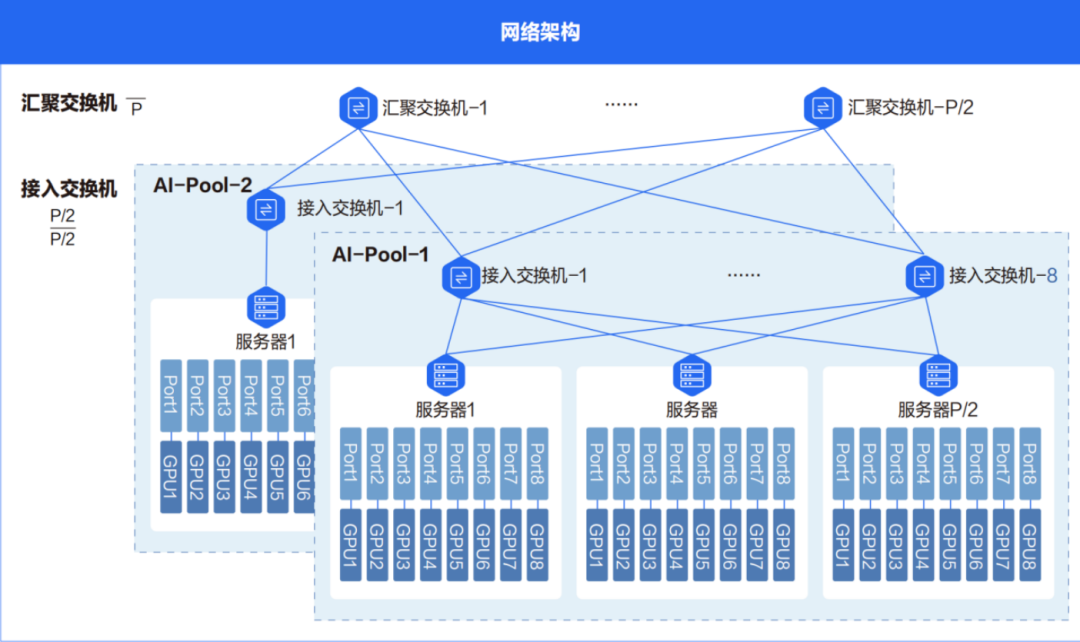 ●构成:一个AI-Pool由8台接入交换机(即8条导轨)及下联的服务器集群组成,典型配置可支持512张GPU卡 13。