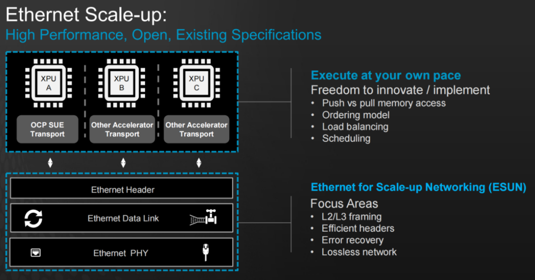 这是博通最精妙的一步棋——网络层博通参与开放“Ethernet for Scale-up Networking (ESUN)”,顺带将自家的SUE-T(传输层)也“借壳上市”,成为ESUN官方合作传输层指导供应商。