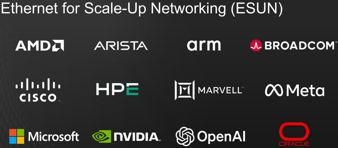 一个在OCP峰会上正式集结的、由几乎所有行业巨头共同支持的“以太网统一战线”——ESUN(Ethernet for Scale-Up Networking)工作组——横空出世。其成员名单石破天惊:AMD、Arista、博通、思科、HPE、英特尔、Meta、微软、英伟达(NVIDIA)、OpenAI、Oracle……