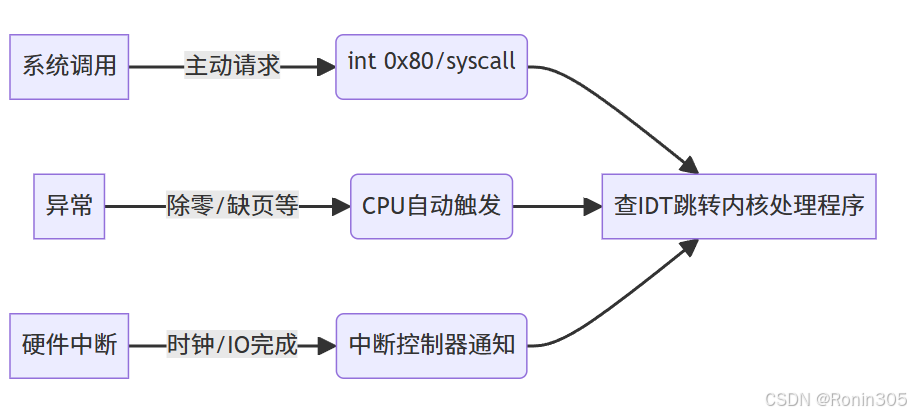 1 (用户→内核) | 系统调用/中断 | 3→0 | 硬件中断指令 | 进入内核处理事件 |