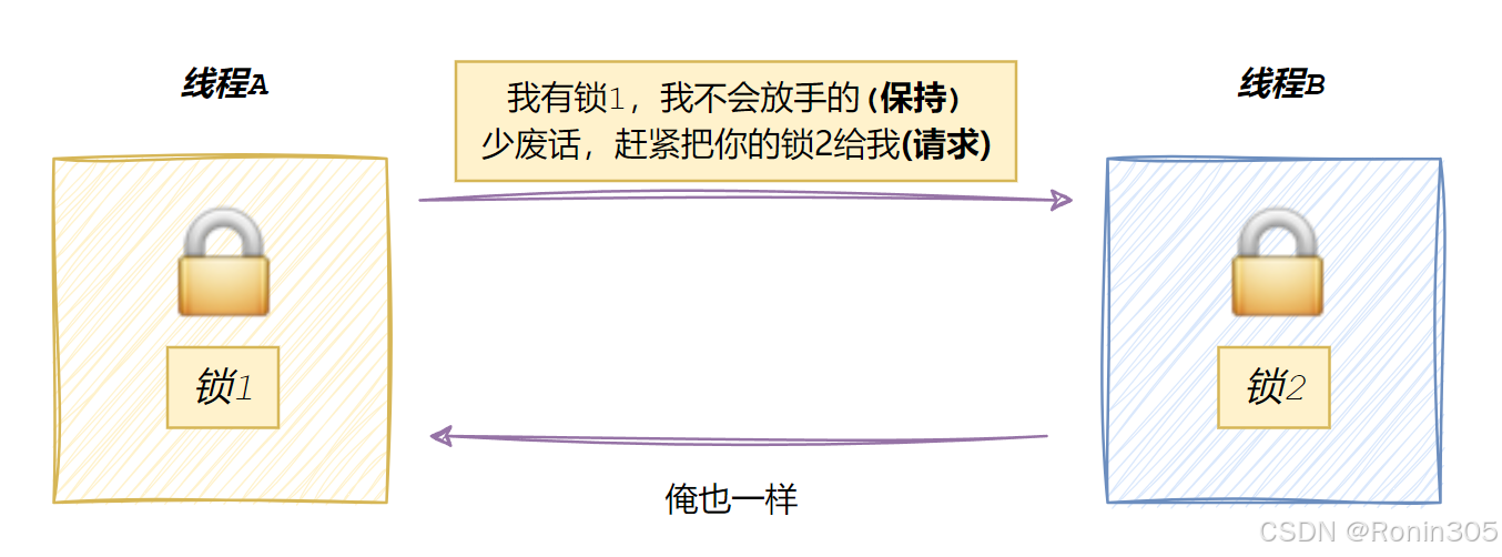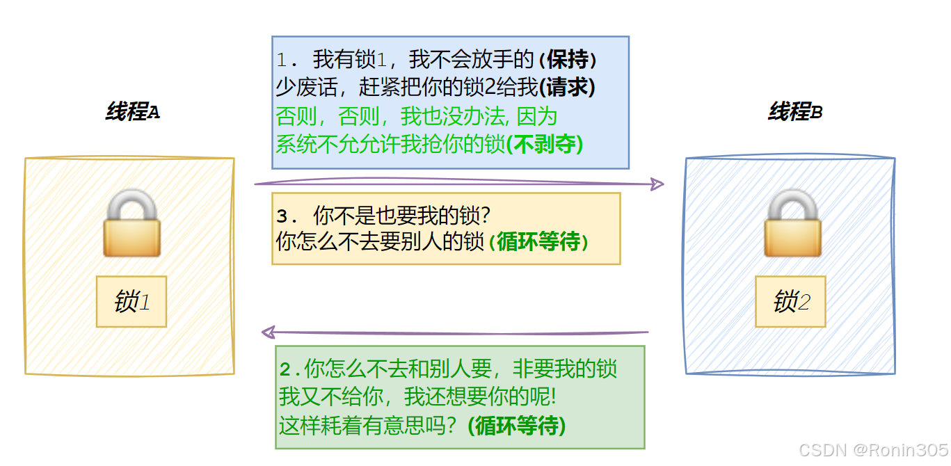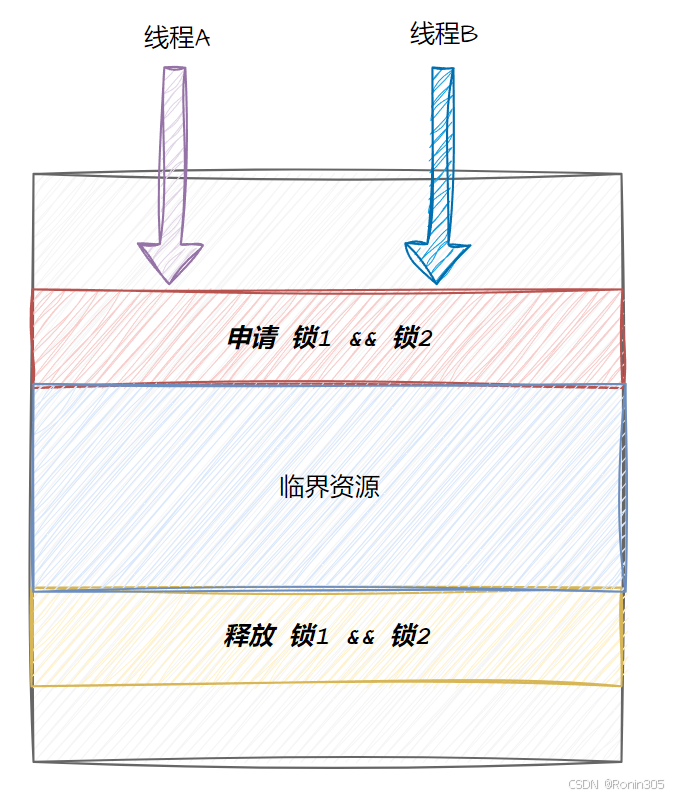 为便于说明,假设线程A和线程B必须同时获取锁1和锁2,才能继续访问后续资源