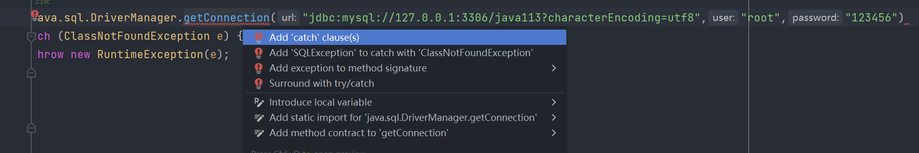}getConnection()方法,通过数据源dataSource.getConnection()获取连接,对外隐藏连接获取的细节(如 URL、用户名密码的配置)。调用者无需关心连接的具体参数,直接调用方法即可拿到连接,降低使用成本。throws SQLException,就必须在方法内部用 try-catch 捕获异常。 /**