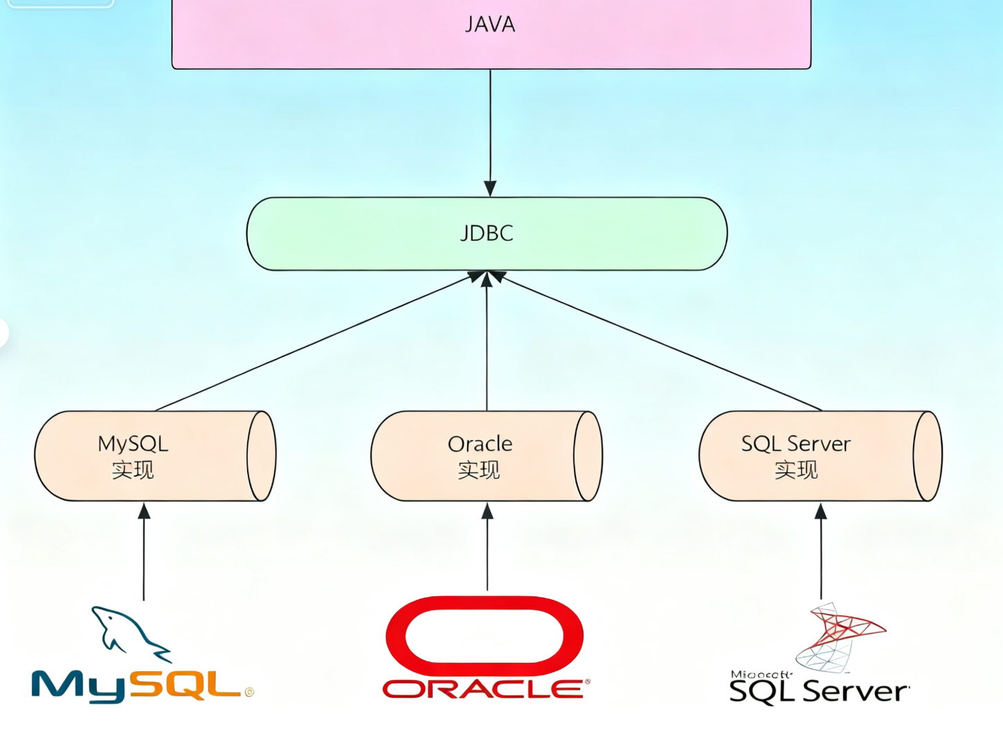 如果JAVA要访问不同的数据库,那么就需要根据数据库的协议进行代码的开发, 为了解决不同数据的使用场景,JAVA中只定义了用于连接和操作数据的接口--JDBC具体的实现由数据库厂商来完成