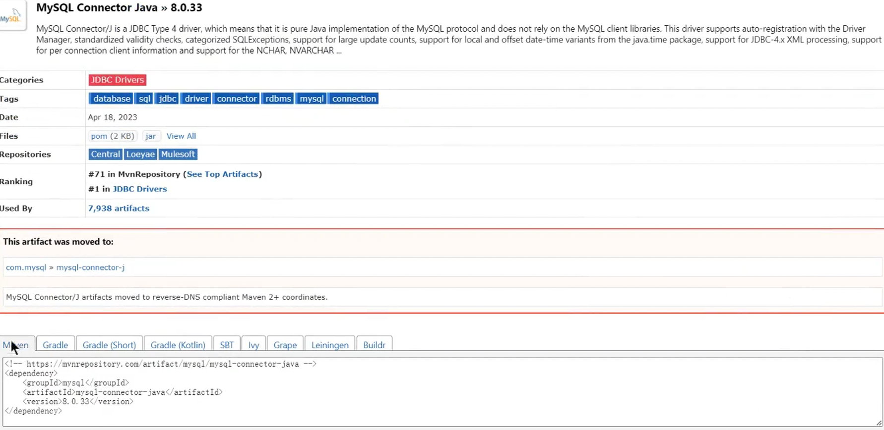 • 在Maven仓库https://mvnrepository.com/artifact/mysql/mysql-connector-java/8.0.33搜索MySQL,找到最新版的驱动包