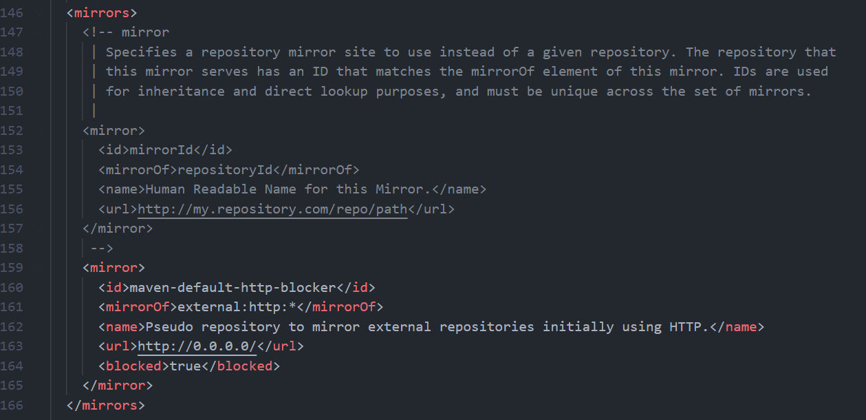 <!-- 加入如下mirror节点 使用国内阿里云仓库镜像 结束-->