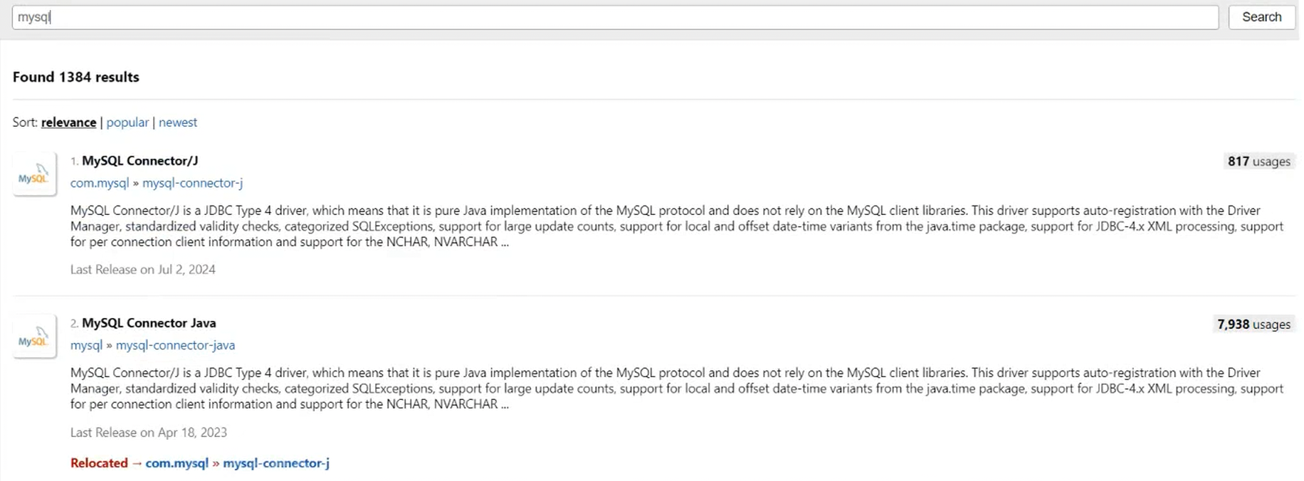 在Maven仓库mvnrepository.com搜索MySQL,找到最新版的驱动包