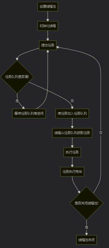 }在这个示例中,创建了一个包含5个线程的线程池,然后提交了10个任务到线程池中。threadPool.shutdown用于在所有任务执行完毕后关闭线程池。