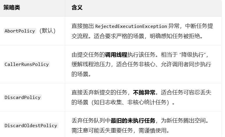 RejectedExecutionHandler handler // 拒绝策略(任务满时的处理方式)