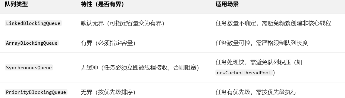 LinkedBlockingQueue(默认无界,推荐)new LinkedBlockingQueue<>(100)),避免任务无限积压。// 有界队列:最多存放 100 个任务