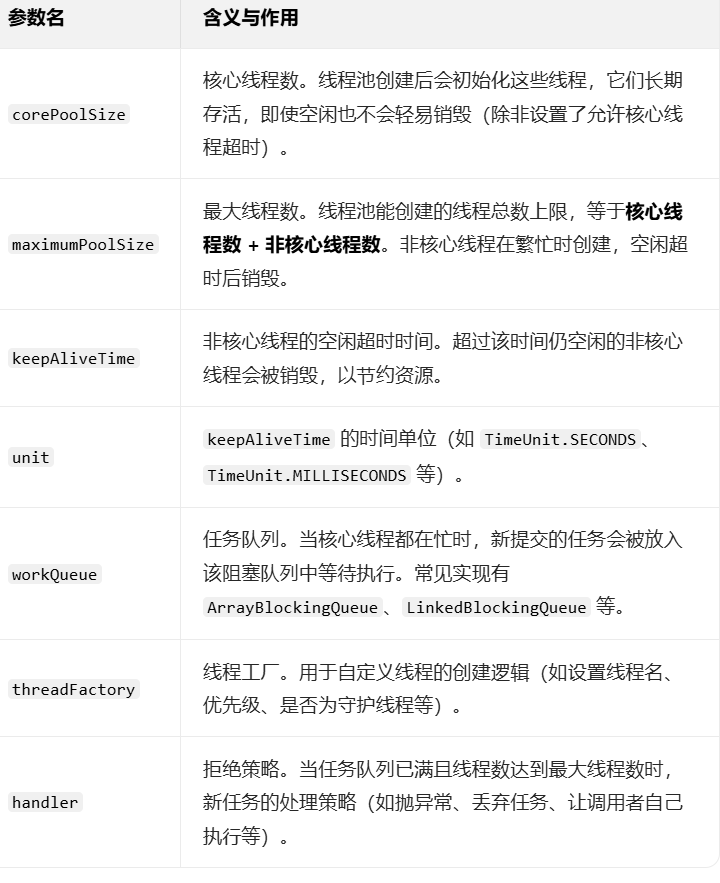 }ThreadPoolExecutor)线程池的核心实现是 ThreadPoolExecutor,通过 7 个参数可灵活配置,避免 Executors 工具类可能带来的资源风险(如无界队列导致 OOM)。