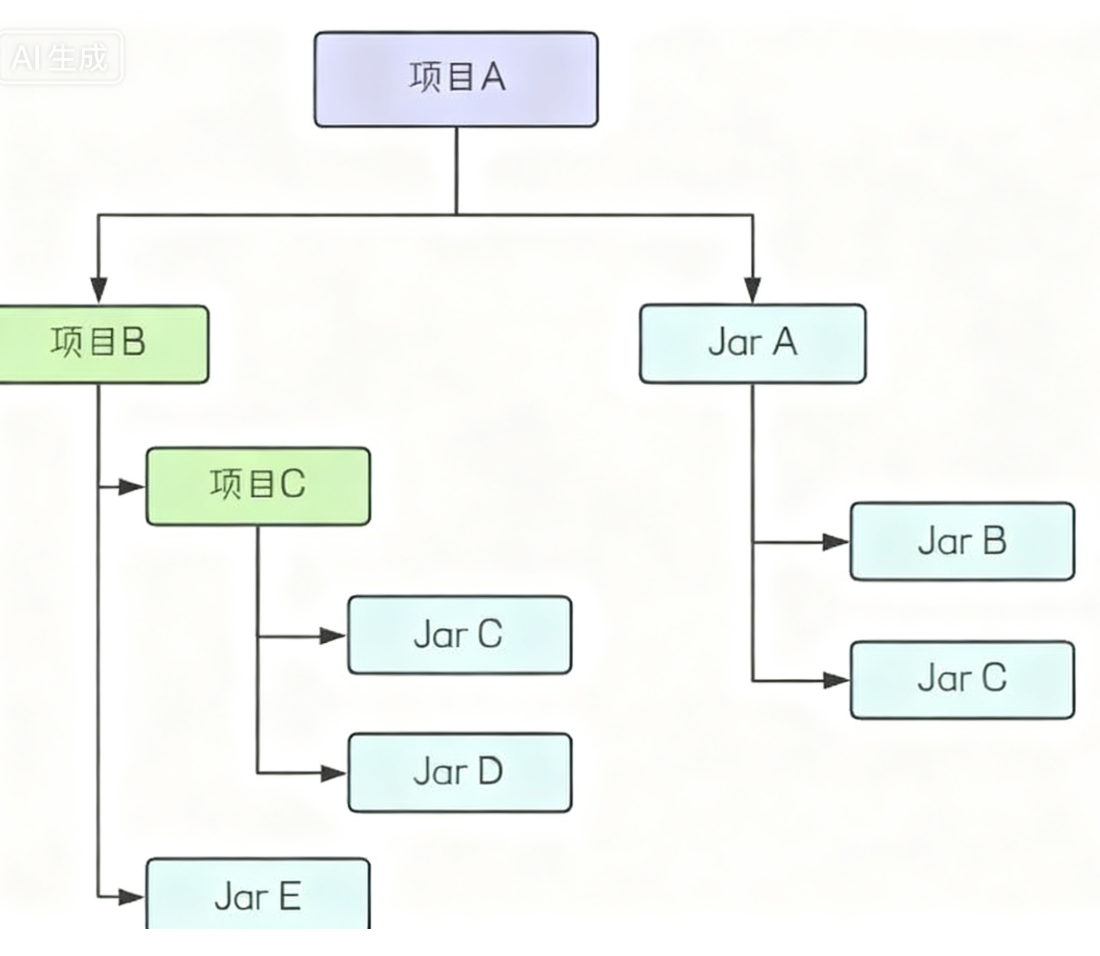 如上图,项目A通过Maven引入JarA时,会自动引入JarB和JarC.