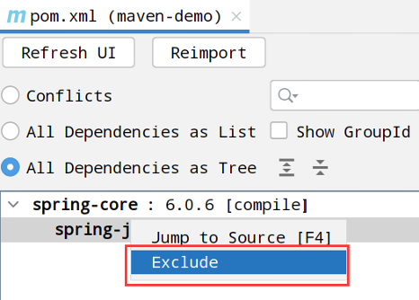 依赖排除 当前阶段我们需要依赖的库并不多,但随着项目的越来越复杂,库之间的依赖关系也会变得越来越复杂.