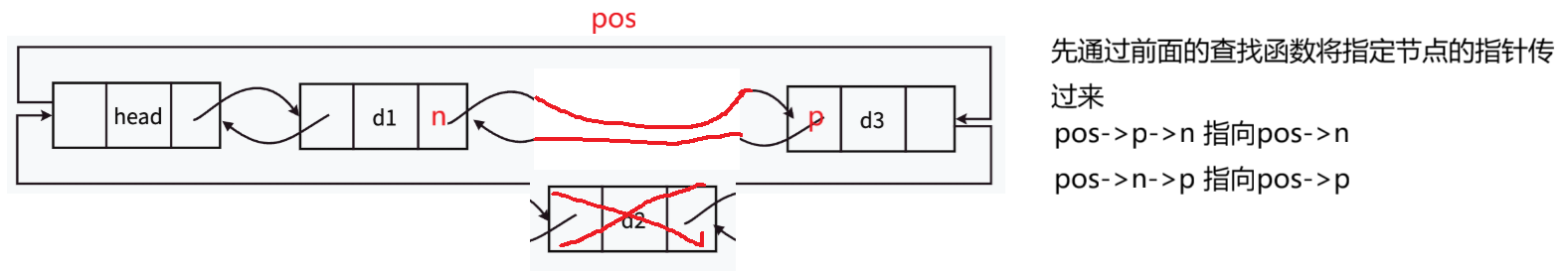 }删除指定算法更加简单,只需要将pos传给函数,在按照图示改变pos前后节点相关指针的指向即可。 (注意:还是,为实现普遍情况,pos前后的节点,用pos相关指针表示)