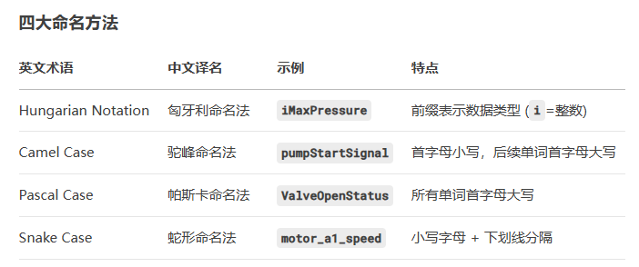 个人推荐的方式是:匈牙利标记法或者蛇形标记法,当然也可以融合两种方式!但是目的就是从变量命名就能获取关键的信息,例如iMotorA1Speed:
