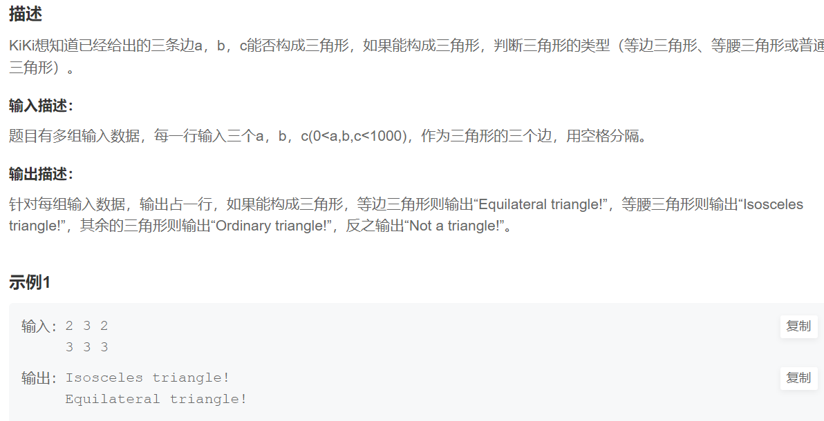 --题目链接:三角形判断_牛客网