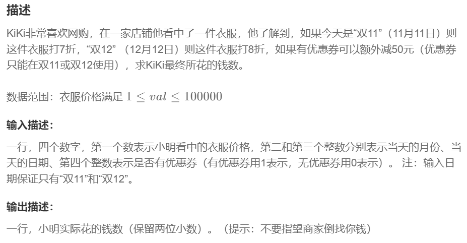 }解题思路—— --本题分支情况清晰,但是有一点要注意,输出描述已经给出:不要希望商家倒贴钱,也就是打折加优惠,价钱为负数时按0算。