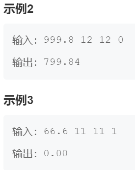 scanf("%f %d %d %d", &price, &m, &d, &n);
