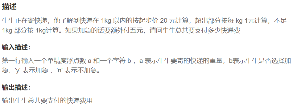 }解题思路—— --本题难点在于如何判断输入的kg数(>1kg)是否有小数部分,这时就可以使用强制转换成int 型:当是整数的时候,int、float 的主要数值相同,反之 int 型 < float 型。