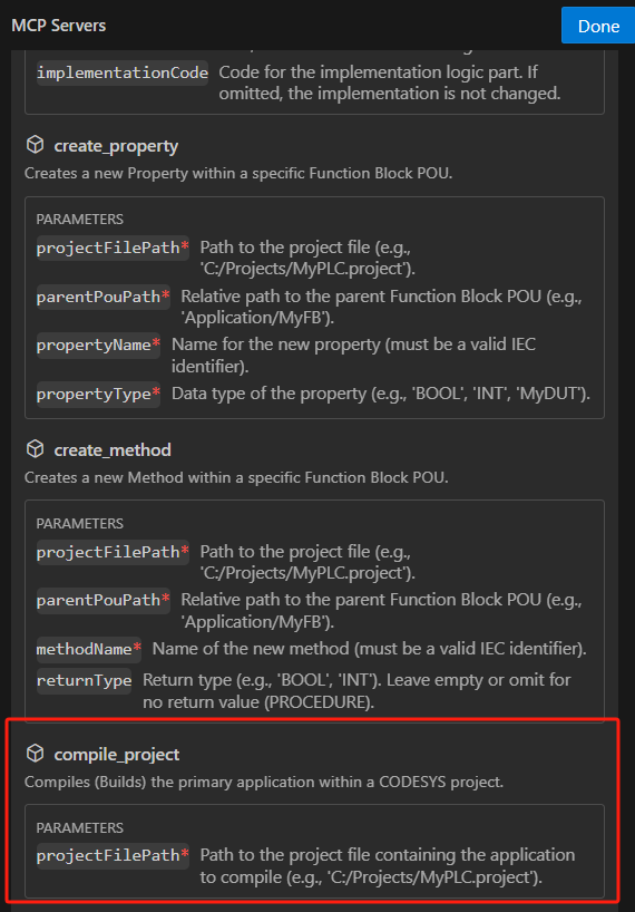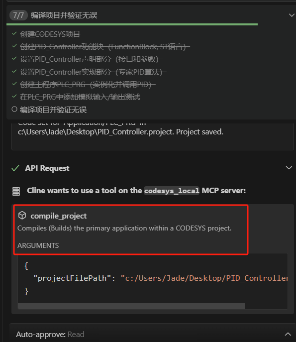 本身在添加mcp server的时候,codesys_local这个mcp服务器具备了compile_project这个Tools,所以在第7步调用的就是它。