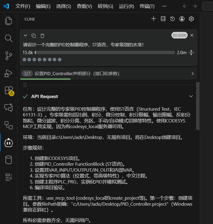 我们这里依然采用的是VSCode+Cline的方式来演示,具体配置步骤参考VS Code + Deepseek API实现一个完整的收放卷项目(含PLC代码):