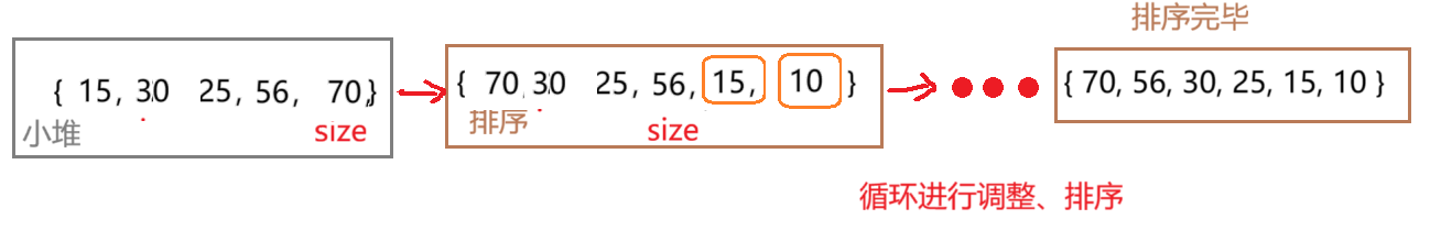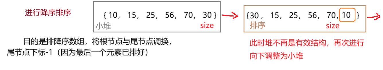 在一开始建完小堆后,就是要进行排降序数组(在数组内部原地操作),具体是-->将根节点数值与尾节点数值交换,完后尾节点下标 size - 1(因为最后一个元素为当前小堆结构的最小数值); 交换完后,堆结构不再是小堆,需要进行向下调整为小堆结构,在次重复调换。 之后就是循环进行1、2步骤,循环条件是--> size > 0(size = 0 ,则表示所有元素已经完成排序)。