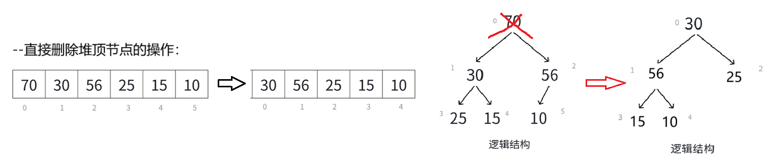 观察发现,直接删除后的堆既不是大堆也不是小堆,而且父子关系发生变化,调整很麻烦。