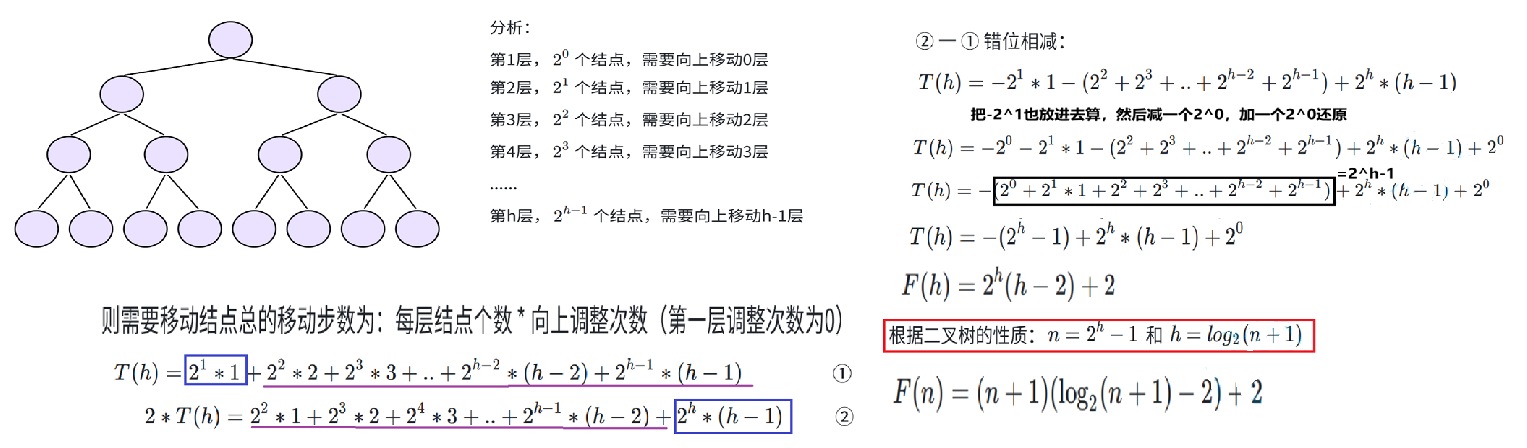那么,就代表着循环的具体次数取决于节点的层数。根据公式:假设满二叉树节点总数是n个,那么节点深度为 --> h = log(n + 1) ( log以2为底, n+1 为对数)。