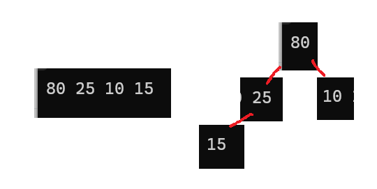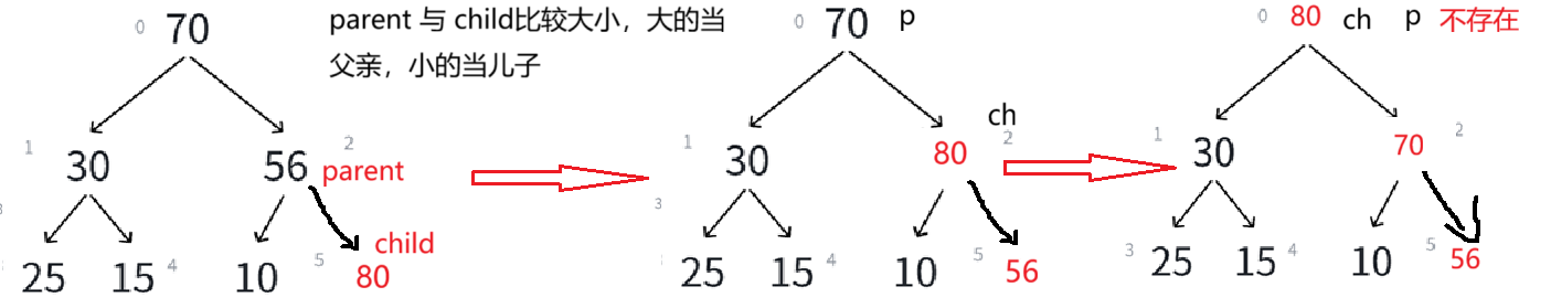 首先定义两个节点,child(指向插入的节点)、parent(指向插入节点的父节点),由求父节点公式--(i + 1)/ 2,找到父节点。 然后parent 与 child 比较大小,交换位置,大的作父节点,小的作子节点;child继续指向插入节点。 重复以上操作(找父节点、比较大小)。最终,求父节点时-->(1-1)/ 2 不存在,结束。