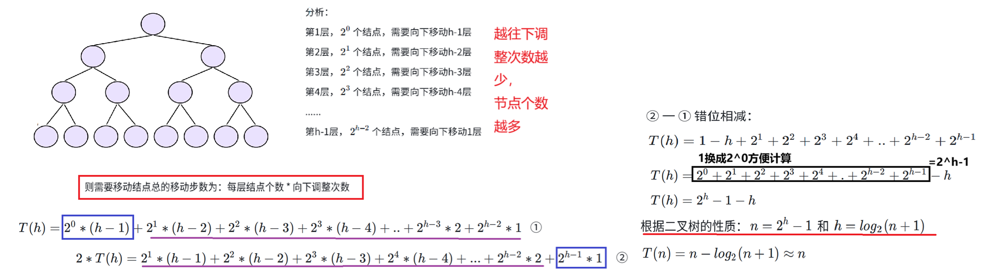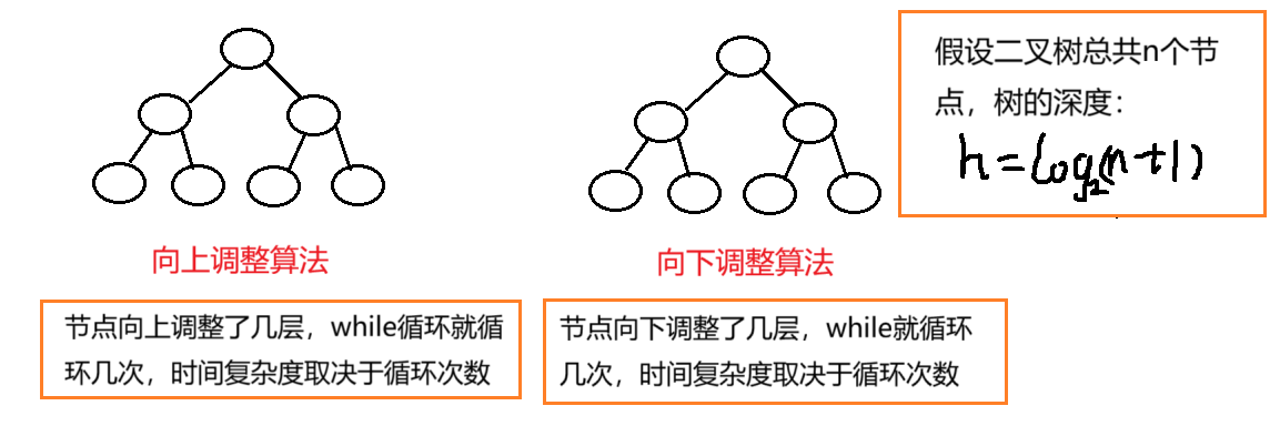 与向上一样,循环的具体次数取决于节点的层数。根据公式:假设满二叉树节点总数是n个,那么节点深度为 --> h = log(n + 1) ( log以2为底, n+1 为对数)。
