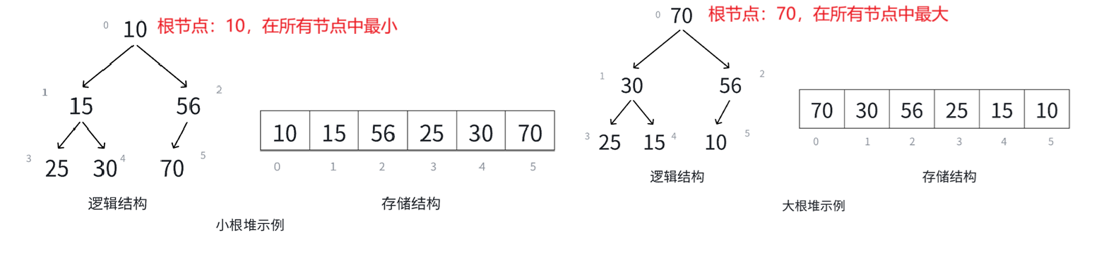 定义:如果有一个关键码的集合K = { , , ,…, },把它的所有元素按完全二叉树的顺序存储方式存储在一个一维数组中,并满足: <= 且 <= ( >= 且 >= ) i = 0,1,2…,则称为小堆(或大堆)。将根结点最大的堆叫做最大堆或大根堆,根结点最小的堆叫做最小堆或小根堆(在左右子树中根节点也是对应的最小 / 最大)