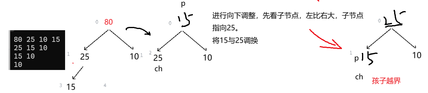 在出堆时,因为会导致堆结构混乱,就要从根节点一层一层的往下调整子节点之间的大小关系。