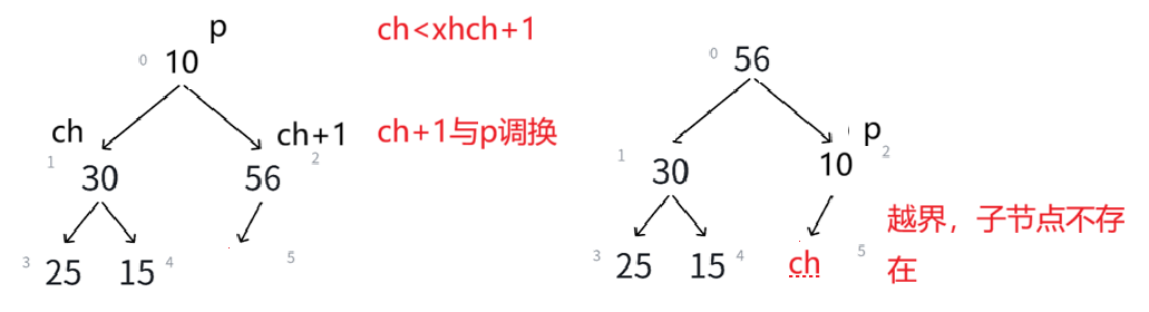 --接口目的:将堆重新调整为大堆或者小堆。 --算法思路:定义两个指针--p(指向10)、ch(左子节点--30);(调整大堆) --由公式2 i + 1求出左子节点,再+1为右节点; --先将父节点的两个子节点比较大小(如果有两个子节点的话),选出大的子节点(30),进行父子交换(此时p仍指向10); 循环进行2、3步。
