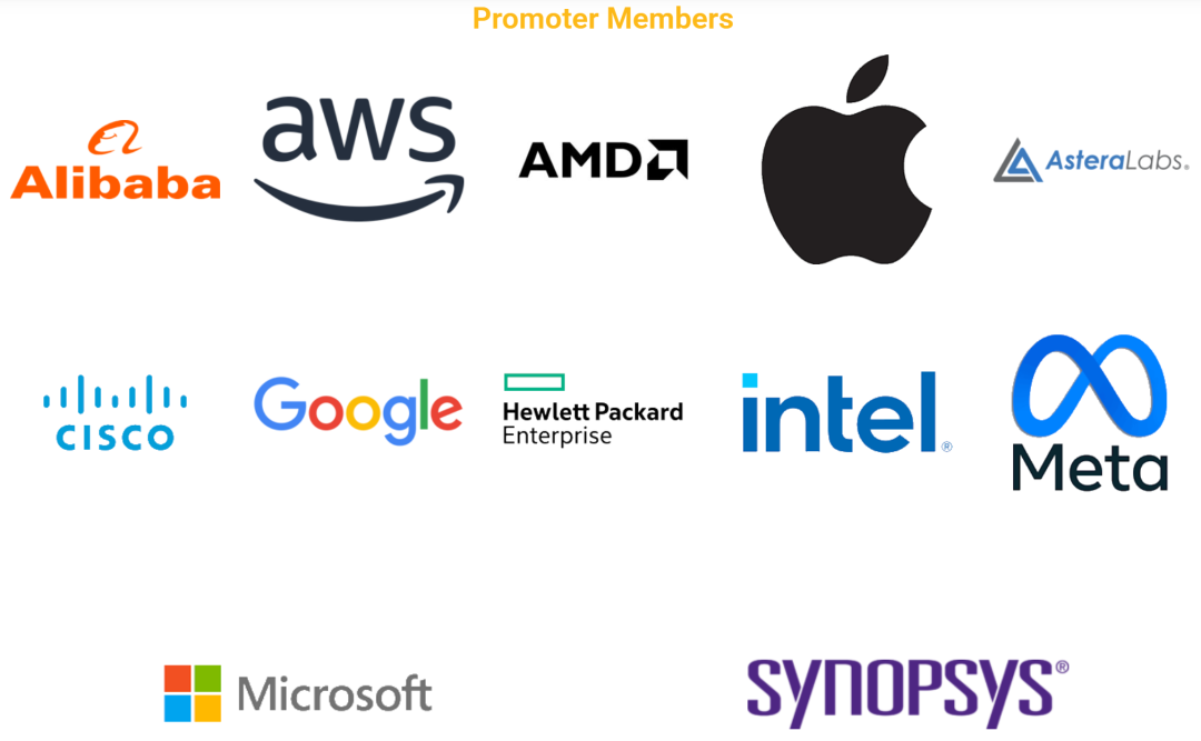 当整个行业都面临着被单一供应商“技术锁定”的共同焦虑时,个体的突围终将汇聚成时代的洪流。如果说EthLink是“独狼”式的先锋探索,那么Ultra Accelerator Link(UALink)联盟的诞生,由AMD、Astera Labs、AWS、思科、谷歌、HPE、英特尔、Meta和微软等“九大长老”共同发起的UALink推广组(Promoter Group),后来字节、腾讯、中兴、华三、ARM也相继加盟,标志着一场由行业巨头们联合发起的、有组织、有预谋的“反NVIDIA联盟”。