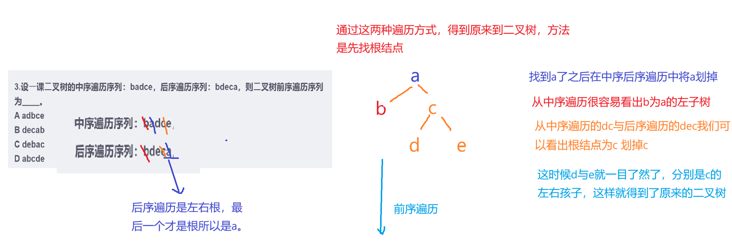 3.设⼀课⼆叉树的中序遍历序列:badce,后序遍历序列:bdeca,则⼆叉树前序遍历序列为____。 A adbce B decab C debac D abcde 选D:
