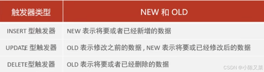 使用OLD、NEW来引用触发器中发生变化的记录内容。现在的触发器还只是行级触发器,不支持语句级触发器。