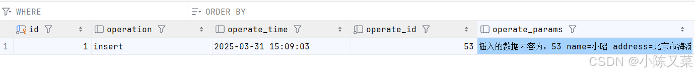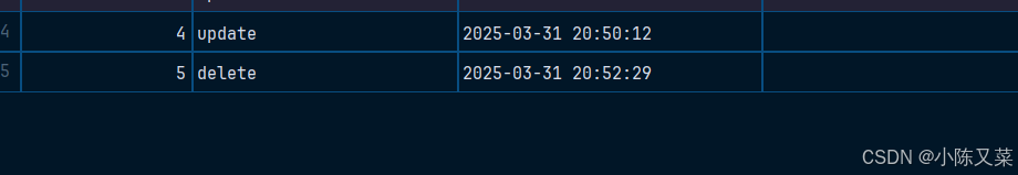 users values(53,'小昭','女','21','1112223334','北京市海淀区');我来查看一下日志表