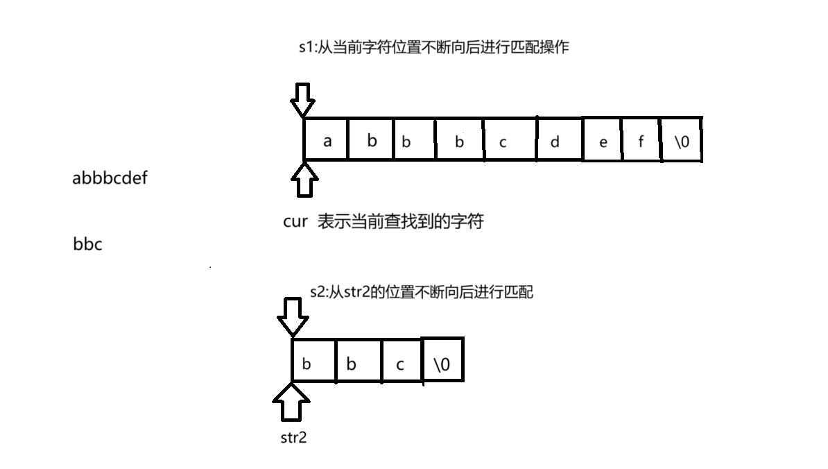 1.cur=‘a’ 时 *s1!=*s2 不进行往后继续查找 cur++ 2.cur='b' 时 *s1==*s2 进行循环往后查找 s1++,s2++ 直到出现s1='b' s2='c'时停止继续查找 cur++,s2重新归为str2的位置 .... 当cur查找到‘\0’的时候,或则s2查找到‘\0’的时候,说明所有查找结束。