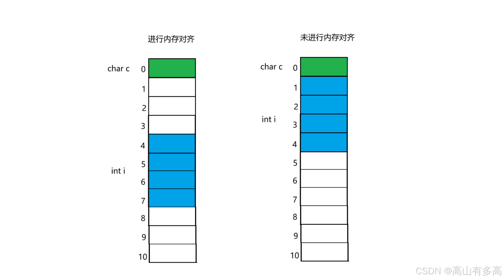 假设我们有一个 32 位的 CPU(一次读 4 字节),我们要读取一个 int 类型的数据(占用 4 字节)。 情况A:如果没有对齐 c 占 1 字节,i 紧接着放在第 2 个字节的位置,读取 i 时就会发生跨块访问。 第 1 步:CPU需要读取第一块内存 [0, 4),取出其中的 1-3 字节。 第 2 步: CPU 读取第二块内存 [4, 8),取出其中的 1 字节。 第 3 步: CPU 进行位移运算(Shift)和合并操作,将这两部分拼成一个完整的 int。 情况 B:内存进行对齐 编译器在 c 后面塞入 3 个没用的字节,让 i 从第 5 个字节(地址 4)开始存放。 CPU 只需要1 个周期,直接读取