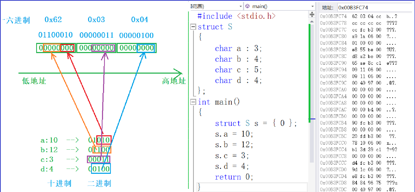 总共需要3个字节大小。 根据上述赋值操作,如下图所示: