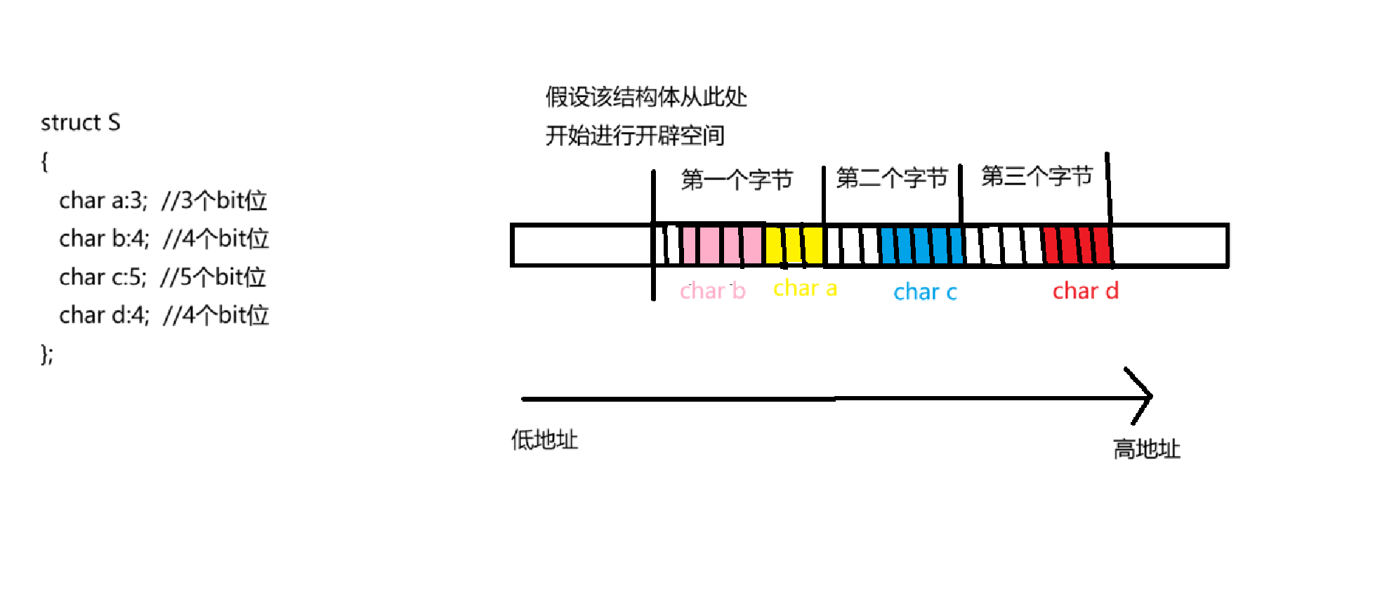 }针对于位段的内存开辟,在vs的环境下有如下规则: ①:按照4个字节(int 型变量) 或则 1个字节 (char 型变量)来开辟空间,然后从右向左填充bit位大小的空间。 ②:若填充所需的bit位空间不足,则需要再另外开辟空间。 所以上述代码的空间开辟如下图所示: