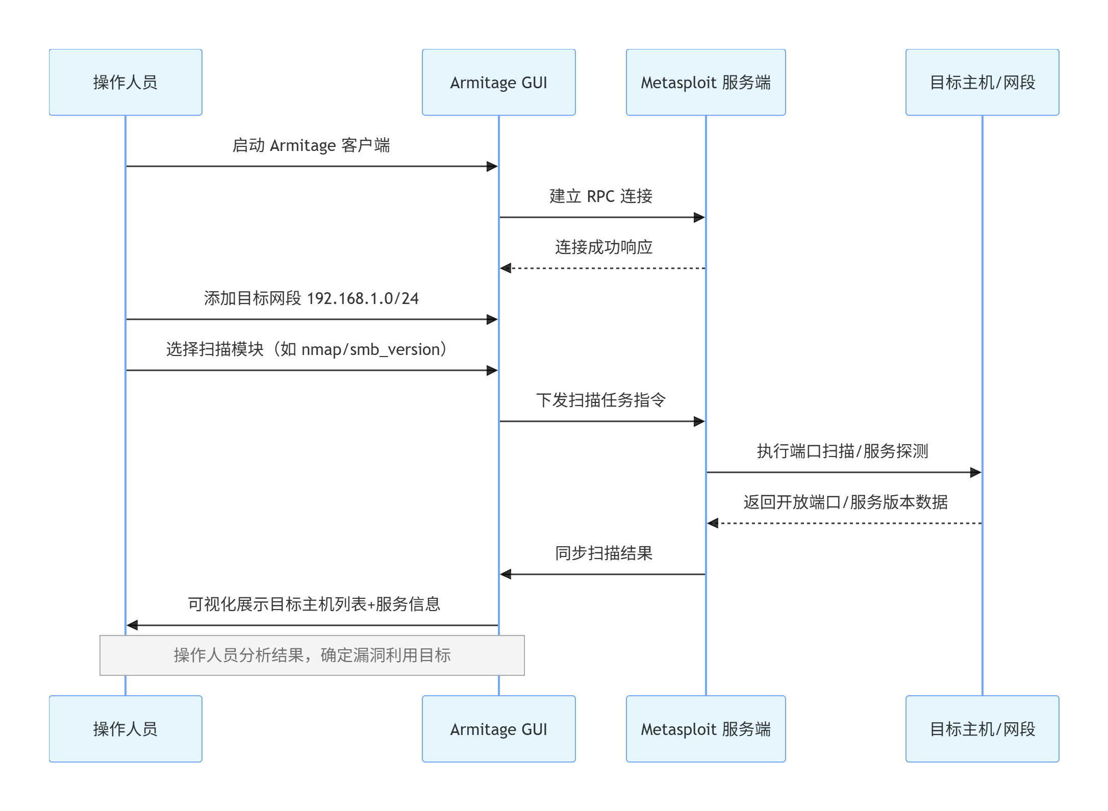 在网络扫描方面,Armitage 主要依赖于 Metasploit 的 db_nmap 命令来执行 Nmap 扫描。Nmap 是一个非常强大的网络扫描工具,能够发现网络上的主机和服务,并进行端口扫描、版本检测等操作。