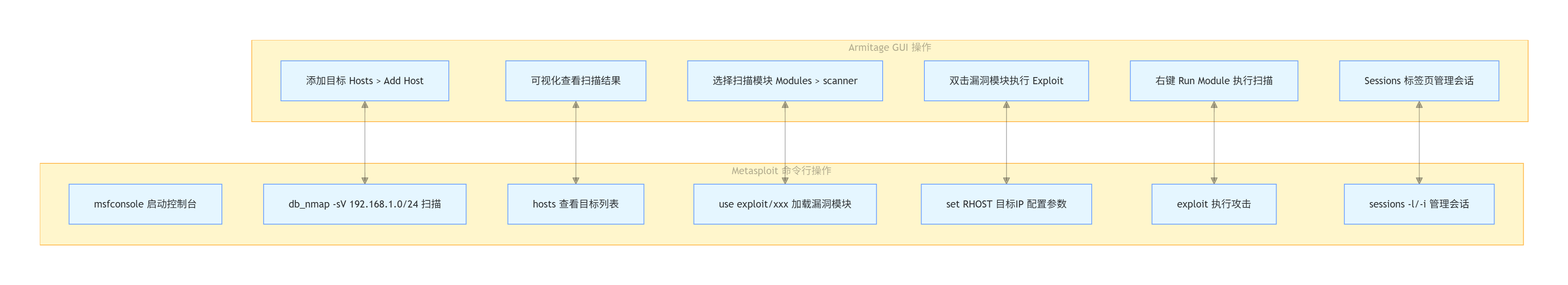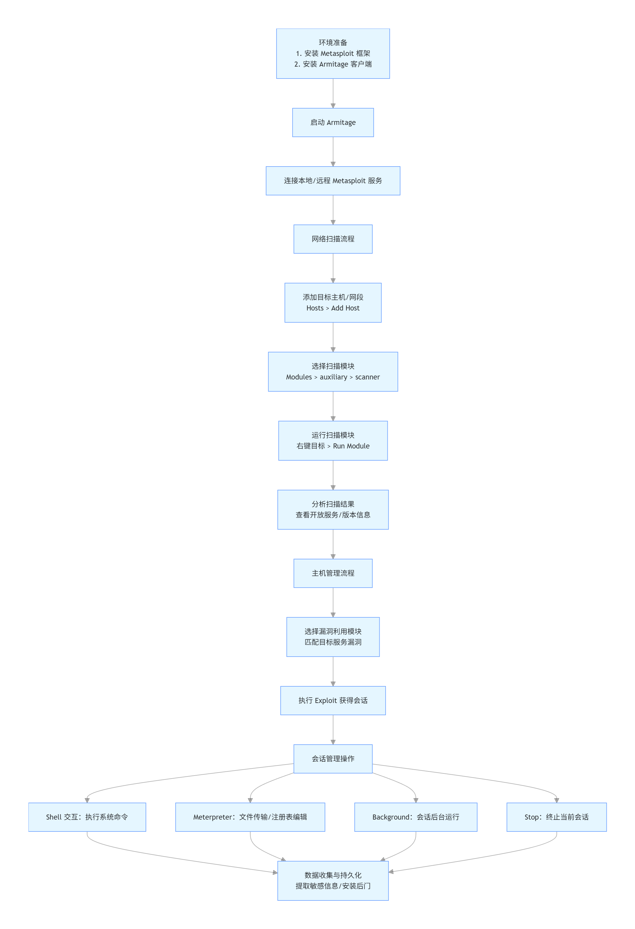Armitage 是一个图形化用户界面(GUI)工具,它基于 Metasploit 框架,用于简化渗透测试过程。Armitage 可以帮助安全专业人员快速地进行网络扫描、漏洞利用和主机管理等操作。下面我将提供一个简单的示例,展示如何使用 Metasploit 的命令行接口(msfconsole)来执行一些 Armitage 中常见的任务,如网络扫描和主机管理。