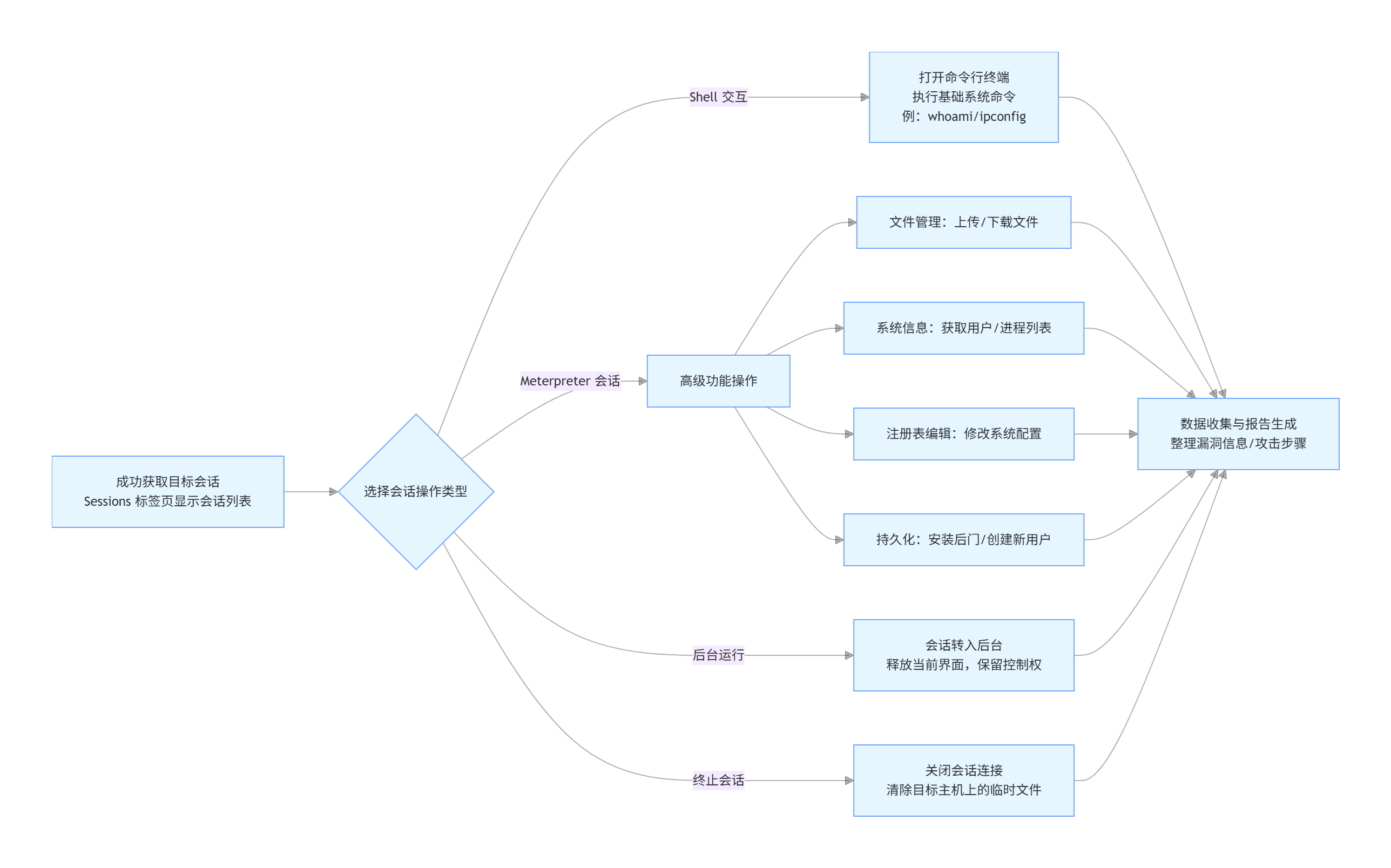 如果你成功利用了某个漏洞并获得了会话,可以使用以下命令来管理会话: