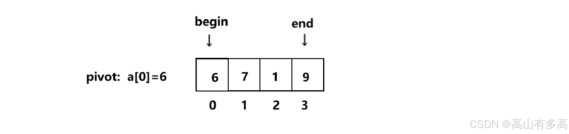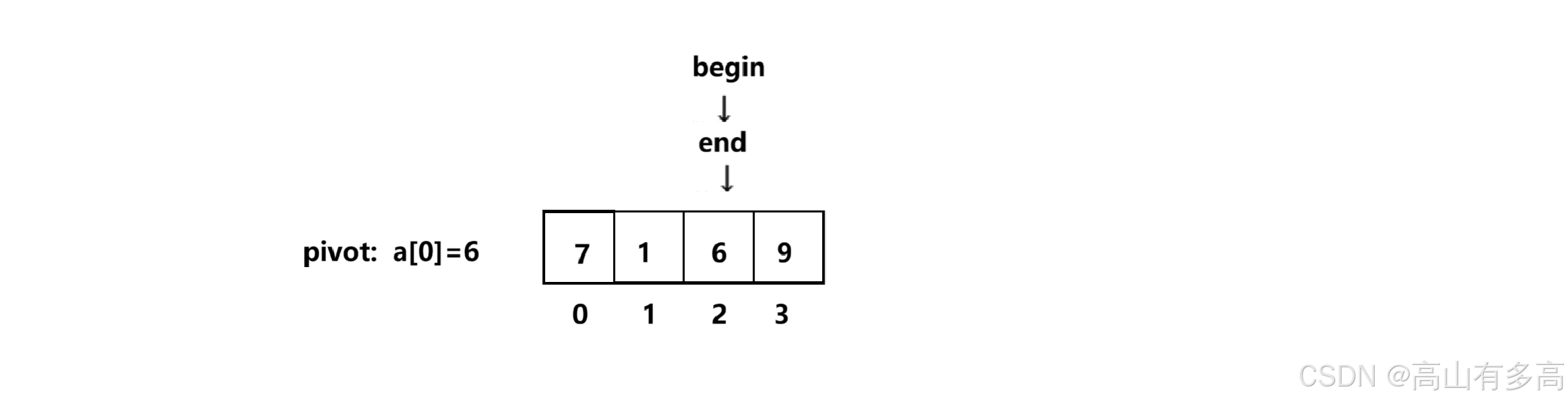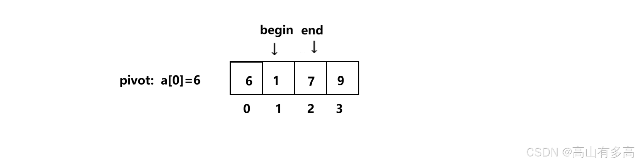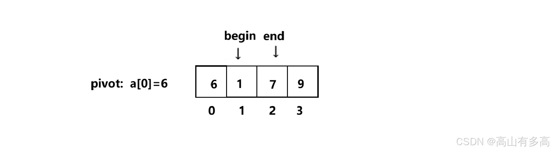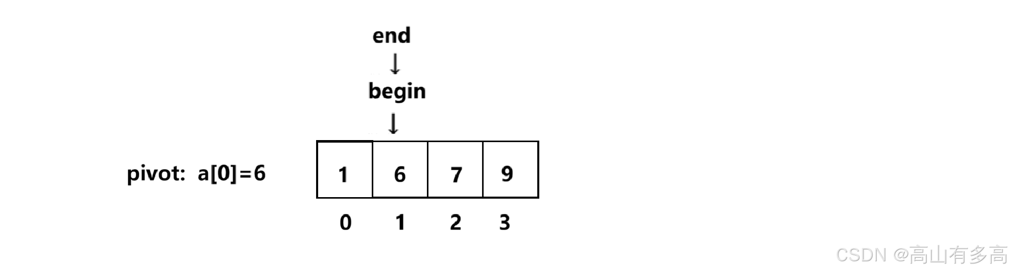 核心原因:为了确保最后与基准值(Pivot)交换的那个数,一定小于等于基准值。 示例解释: 假设数组是:[6,7,1,9] 索引是: [0 1 2 3] 基准值(Pivot)是 6 Begin:指向