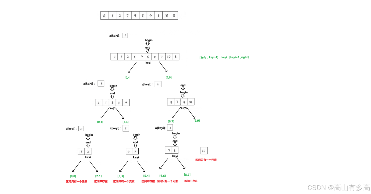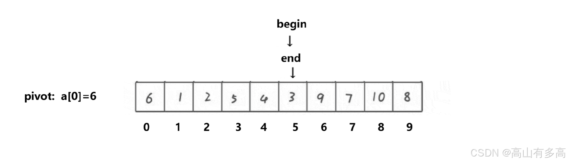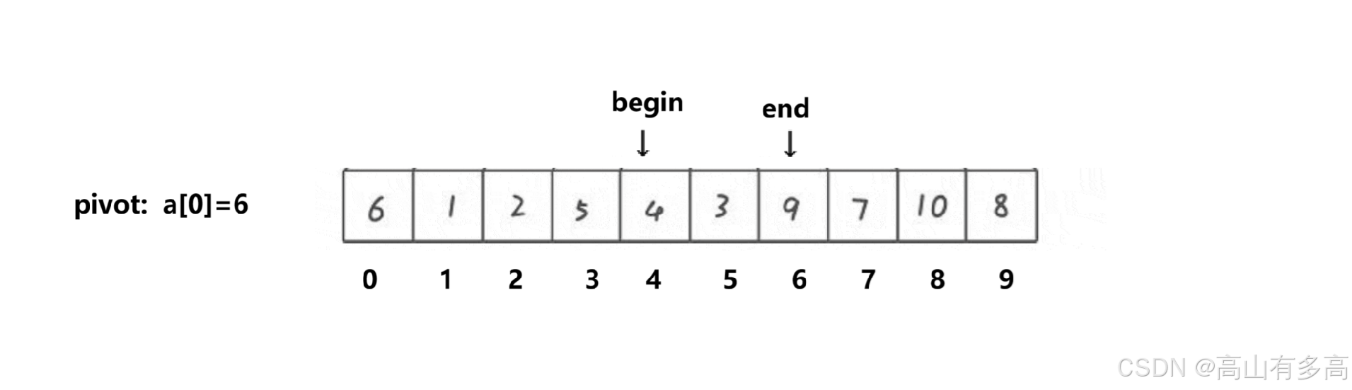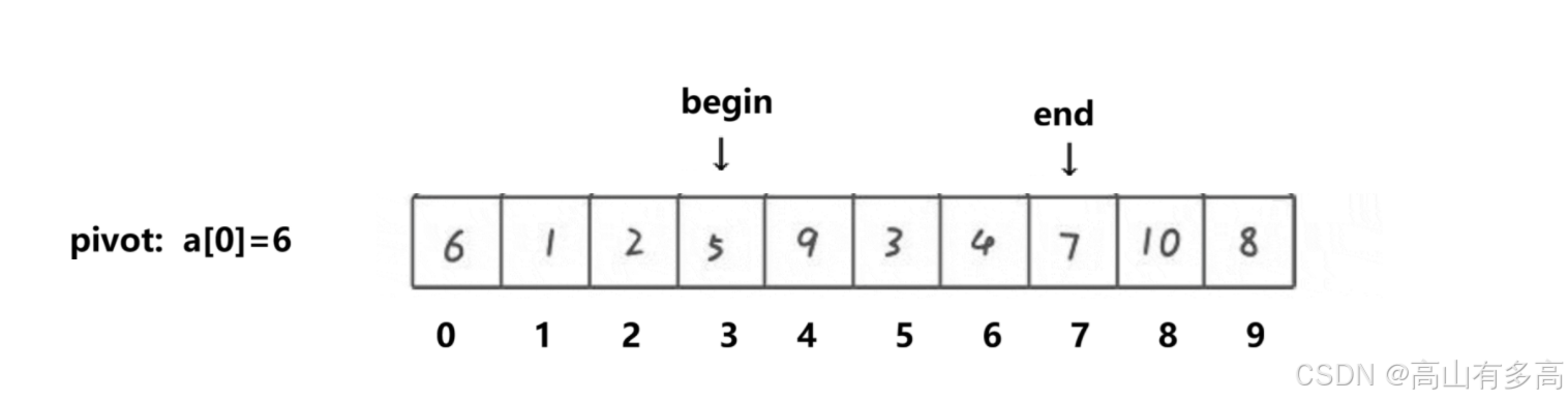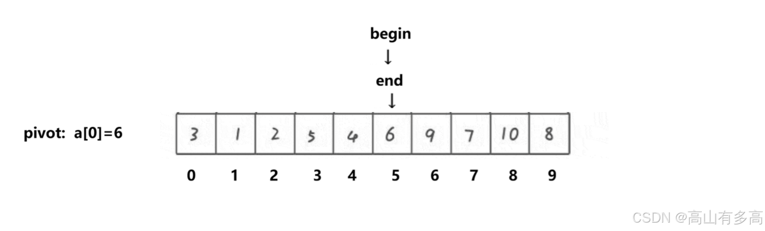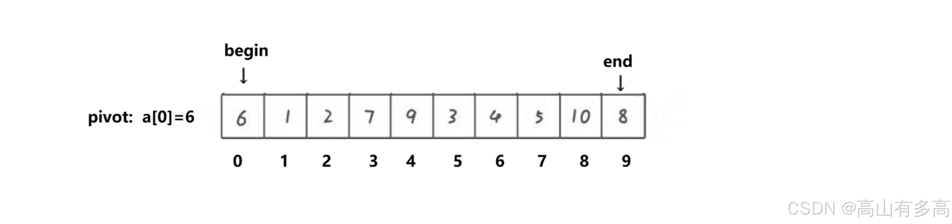 我们可以采用(Hoare分区法)定义左右指针,以数组 [6, 1, 2, 7, 9, 3, 4, 5, 10, 8] 为例进行说明。