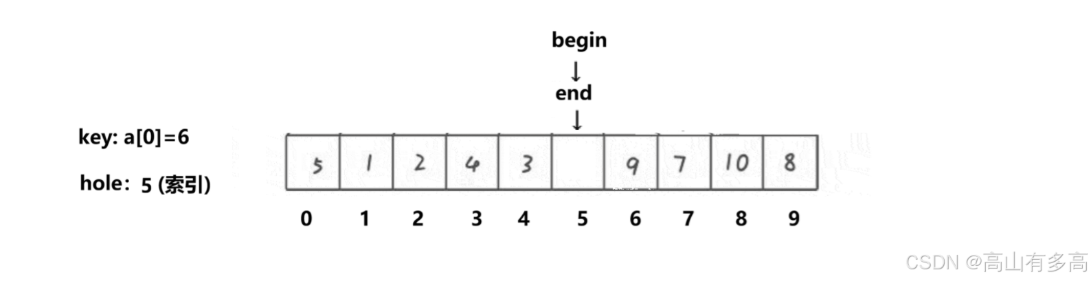 核心思想:一个萝卜一个坑,挖坑法的逻辑就像是挪动一个空位。 挖第一个坑:我们先把基准值(Pivot)拿出来,存到一个临时变量 key 里。这时候,基准值原来的位置就变成了一个 “坑” (Hole)。 填坑游戏: ①右边找小数填左坑:右指针 end 开始走,找到比 key 小的数,把它挖出来,填到左边的坑里,这时候,end 的位置变成了新坑。 ②左边找大数填右坑:左指针 begin 开始走,找到比 key 大的数,把它挖出来,填到右边的坑里。这时候,begin 的位置变成了新坑。 ③循环:左右交替填坑,直到 begin 和 end 相遇。 ④基准归位:最后相遇的那个位置肯定是个坑,把最开始保存的 key 填进去。完美!