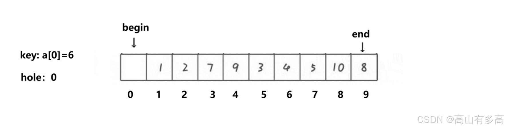 }我们可以采用(Dig-hole 挖坑分区法)左右指针,以数组 [6, 1, 2, 7, 9, 3, 4, 5, 10, 8] 为例进行说明。
